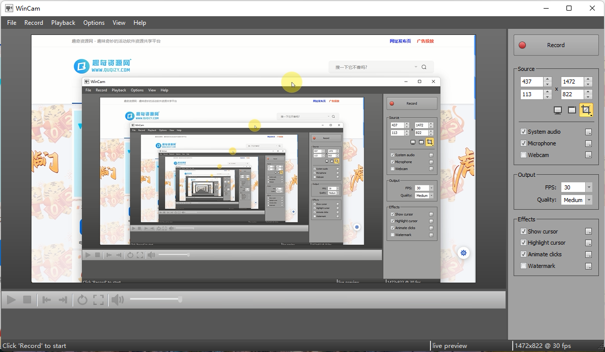 WinCam是一款国外优秀的录像软件,能够得心应手录制区域及整个屏幕,软件小巧易用,功能一点不弱;WinCam提供多种录制方式,包括全屏、活动窗口、720P高清区域、并可在录制之前预设好视频效果,如光标、点击动画、视频水印等,此外还具有视频编辑功能,这样你可以在最短时间内获得不错的录制视频。
