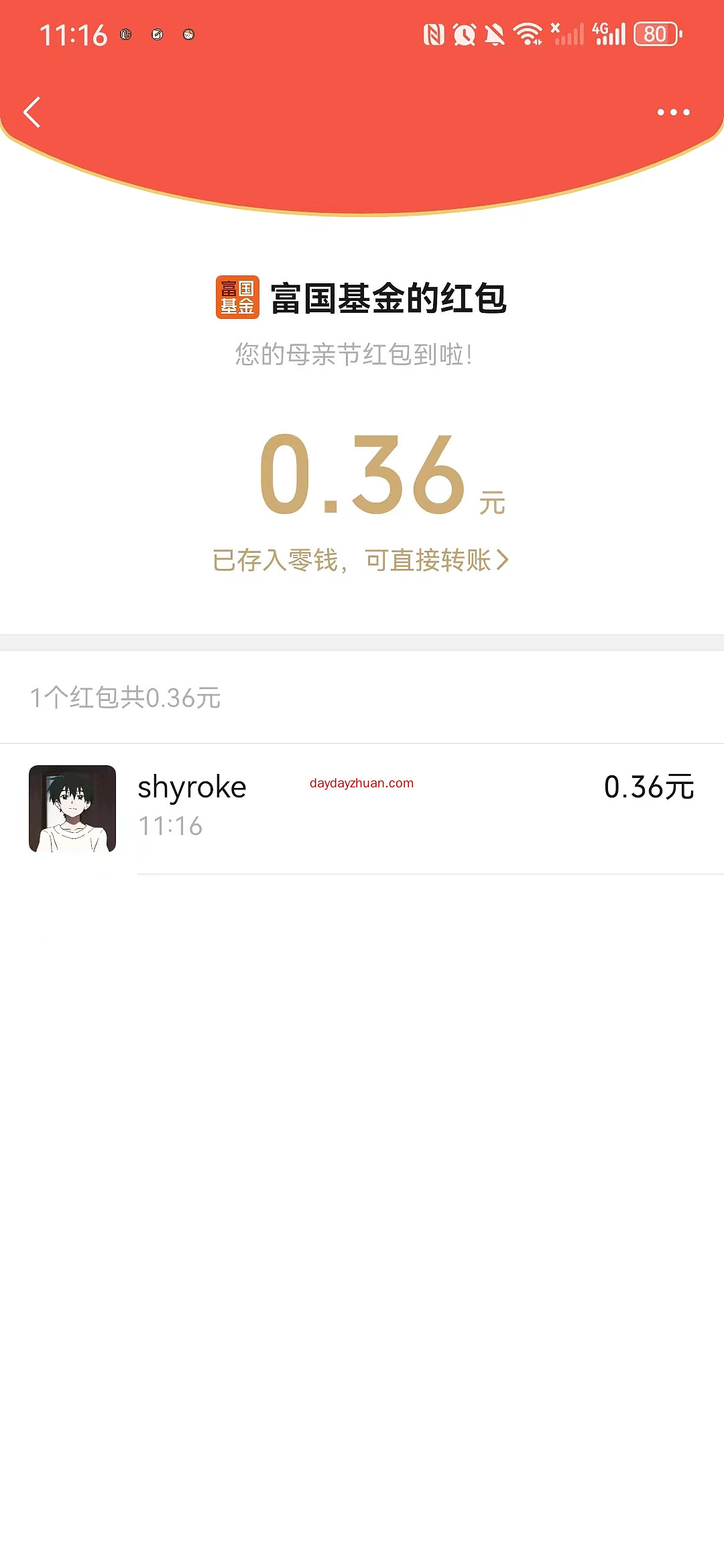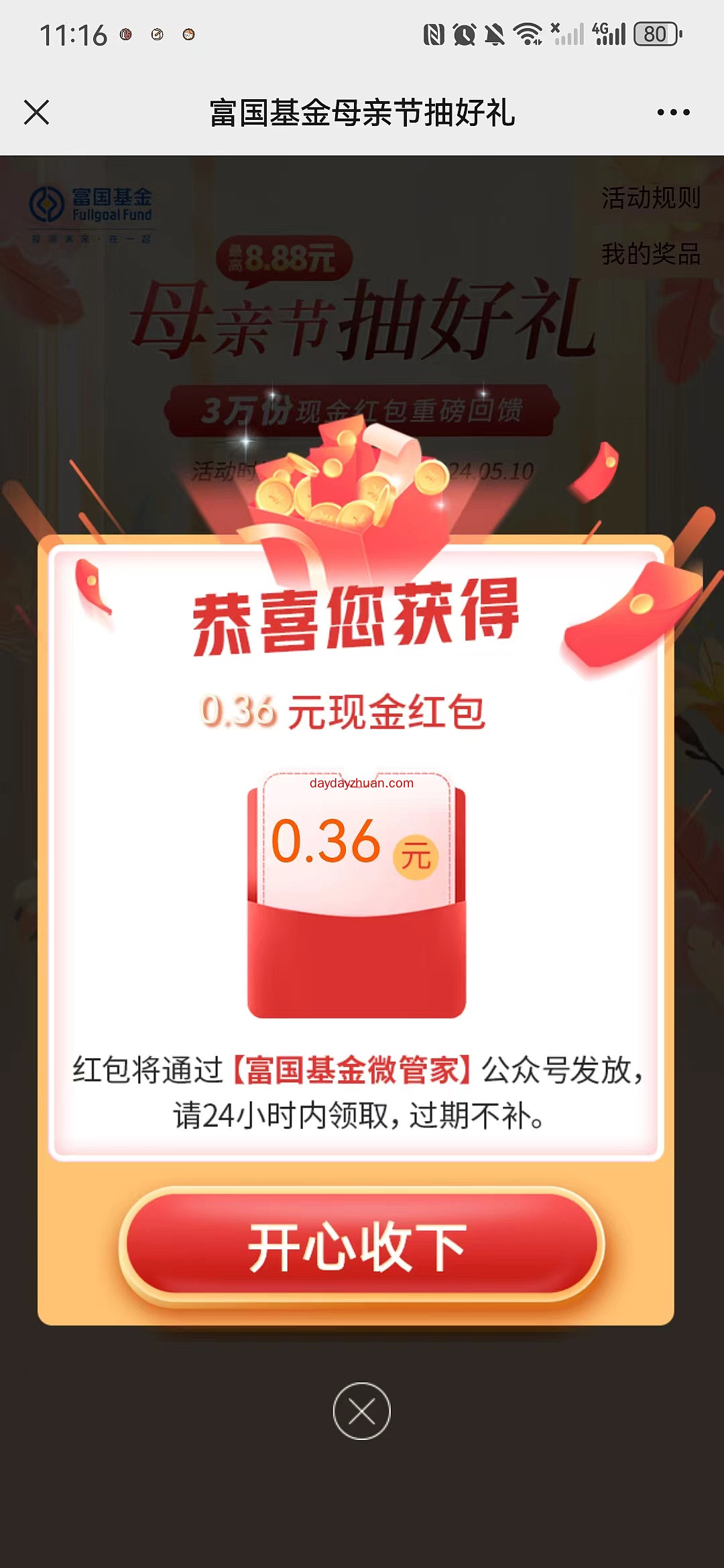 富国基金公众号羊毛活动又来了,这次是母亲节活动,新老用户送1~3次抽奖机会,小编是2次,亲测中了0.36元微信红包,手动领取,天天线报网的赚友赶紧上吧。 1、微信扫码关注【富国基金微管家】点击菜单栏【母亲节红包】进入,没有绑定账号的微信进去可以抽奖1次,绑定过账号的可以抽奖3次。