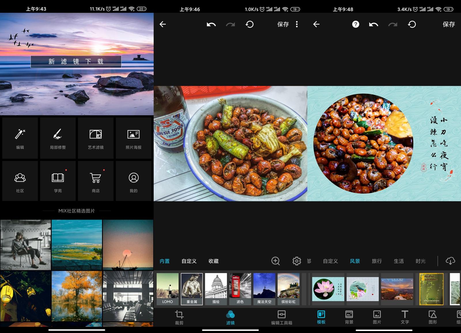 MIX内置了超过130款高品质滤镜。这些滤镜涵盖了很多不同的照片风格,其中既有胶片时代的专业彩色反转片滤镜,也有自动识别人脸并磨皮增白的自拍滤镜;既有讲究线条和影调的单色滤镜,也有追求夸张色彩的LOMO滤镜。总之,MIX内置的10余组滤镜各有特点,总能满足你的需求。美化照片不需要很多专业知识,只需选择合适的滤镜,照片立即变得不同。