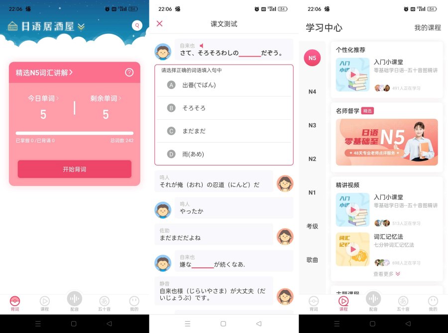 完备日语词库 科学背词 新标日、新编日语、能力考等各类词库一应俱全。全新的背词模式,科学高效。