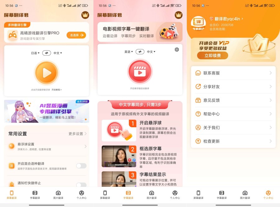 屏幕翻译君是一款屏幕实时翻译APP,支持翻译游戏界面、聊天内容、日韩漫画、国外新闻、海外APP界面、照片翻译等。支持将76种语言的屏幕文字(包括英文、中文、日文、韩文等)翻译成全球100多种语言。多引擎支持——更全能,支持游戏翻译、漫画翻译、全屏翻译、屏幕区域翻译、聊天翻译、图片网页翻译等;原文覆盖翻译——更自然,译文融入到游戏画面中,就像游戏原生支持一样,媲美汉化;极速翻译引擎——更快速,翻译结果显示快至0.5秒;高精翻译通道——更准确,屏幕文字识别和翻译均采用头部先进的技术,支持智能识别和翻译,译文更人性化;悬浮球设计——更易用,单击悬浮窗即可在任意界面全屏翻译,无需切换界面;支持自动翻译,快速翻译聊天输入框中的文字; 【使用方法】支持安卓15-16系统运行